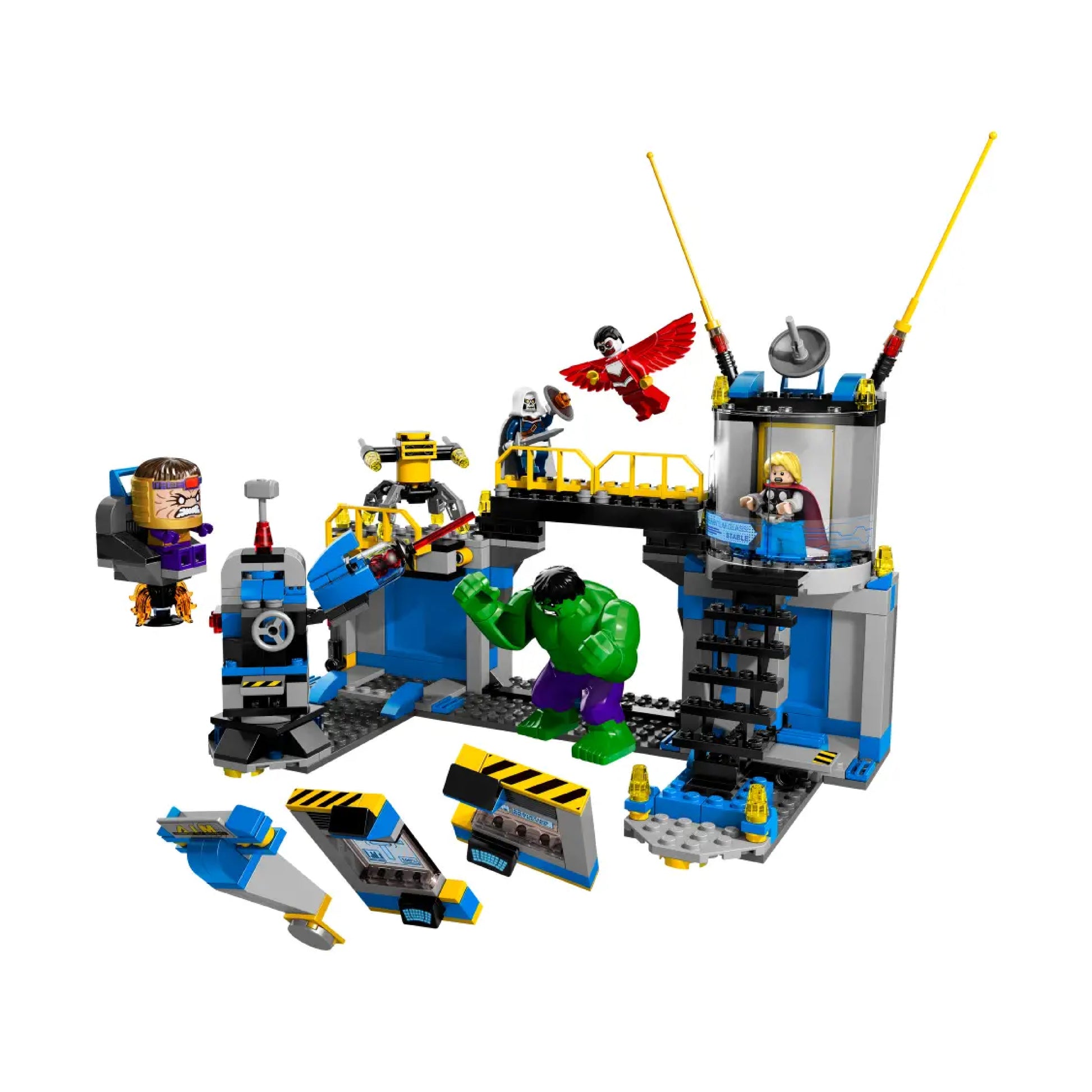 Deep in the underground lab of the A.I.M. organization, Thor is being held captive by Taskmaster and the evil MODOK. Help Falcon break in and overpower the super villains, while Hulk smashes through the lab wall and goes on the rampage! Can he destroy the hammer-powered laser cannon and smash the shields to release Thor from his shielded cell? Only you can decide. Includes 4 minifigures with assorted weapons: Thor, Falcon, MODOK and Taskmaster plus Hulk figure.