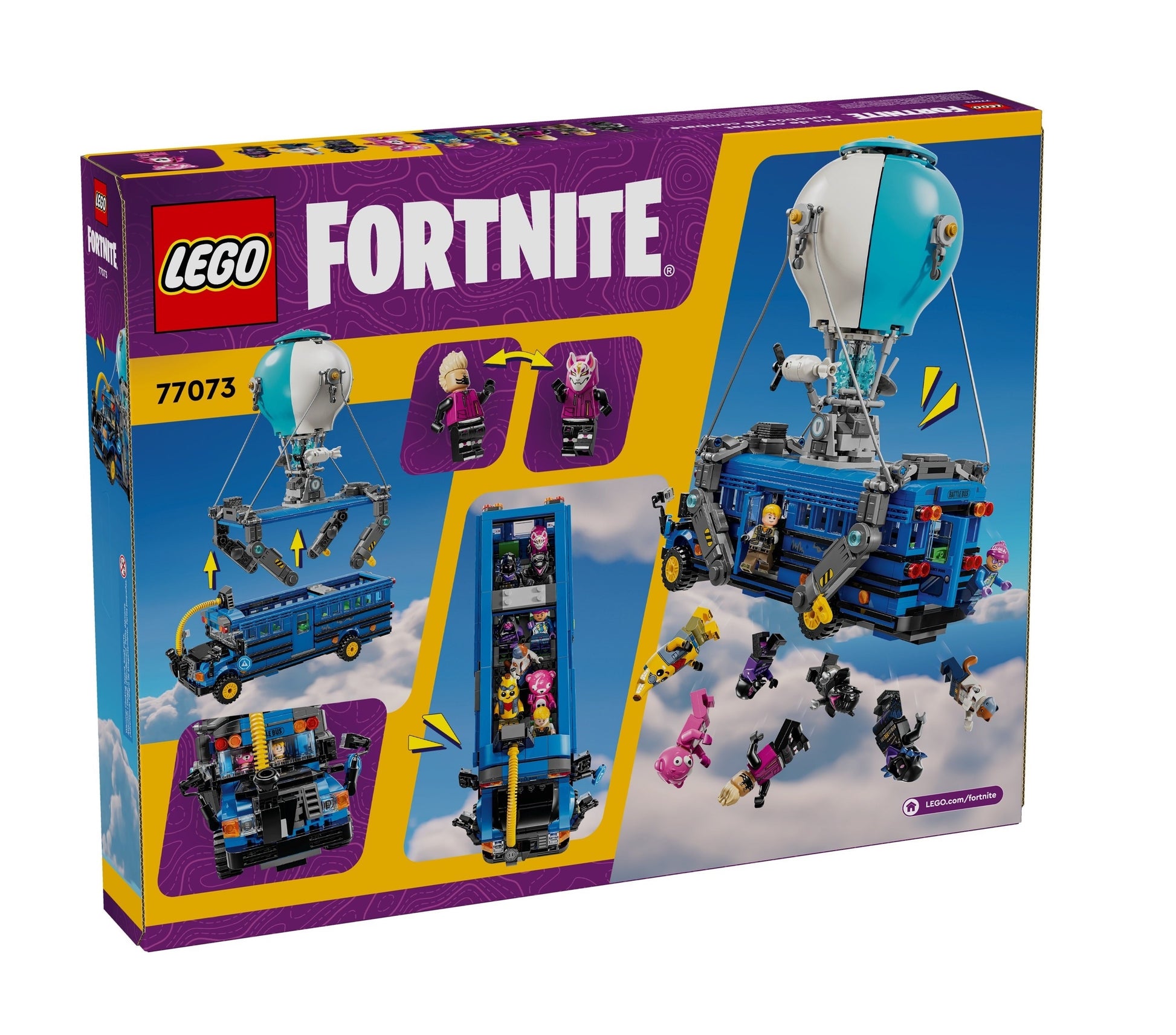 Fans journey into the exciting LEGO Fortnite world as they build the bus, which has rolling wheels and a removable roof, and the instantly recognisable hot-air balloon. But that’s just the start! Once the bus is complete, they’ll delight in discovering iconic accessories such as Slurp Juice, a Grappler, Pickaxes and Slap Juice, as well as 9 minifigures of iconic Fortnite outfits. Bringing the adventure to life, these can be seated inside the bus to fuel creative role play.