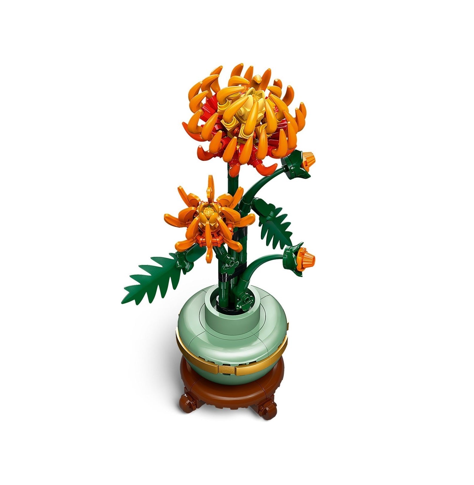 This detailed replica, with posable leaves and petals, captures the vivid orange flower in bud, blooming and in full bloom and comes with a pastel-green flowerpot decorated with a golden band and set on a wood-effect plinth. Easy to assemble, the model chrysanthemum plant makes an elegant centerpiece for any space and can be displayed alongside other sets from the LEGO Botanical Collection.