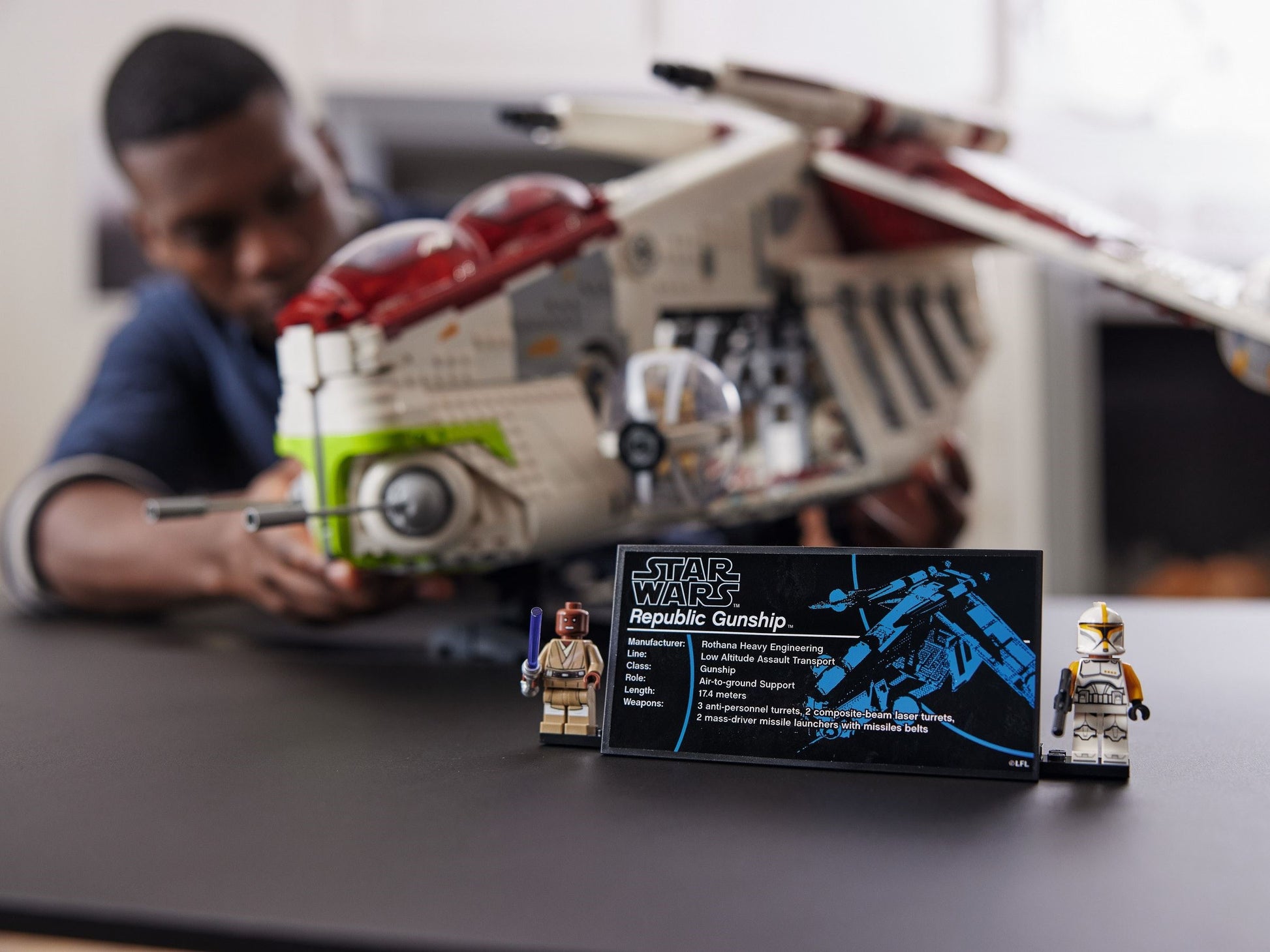 Spark memories of the epic Battle of Geonosis in Star Wars: The Clone Wars with this Ultimate Collector Series build-and-display model of a Republic Gunship (75309). Authentic features of a Low Altitude Assault Transport (LAAT) vehicle are beautifully reproduced in LEGO® bricks, including the pilot cockpits, swing-out spherical gun turrets, 2 cannons on top, super-long wings, opening sides and rear hatch and interior details.
